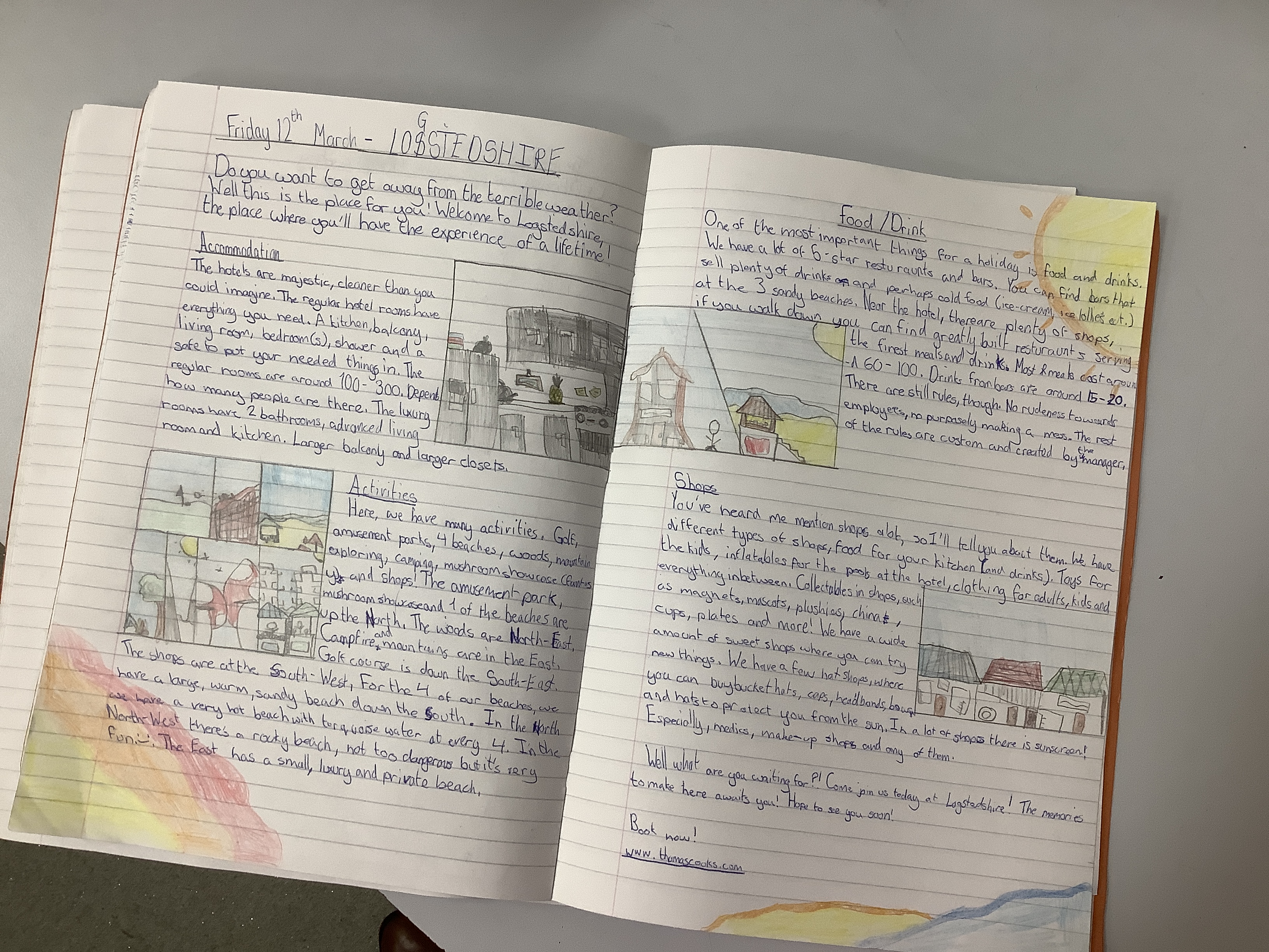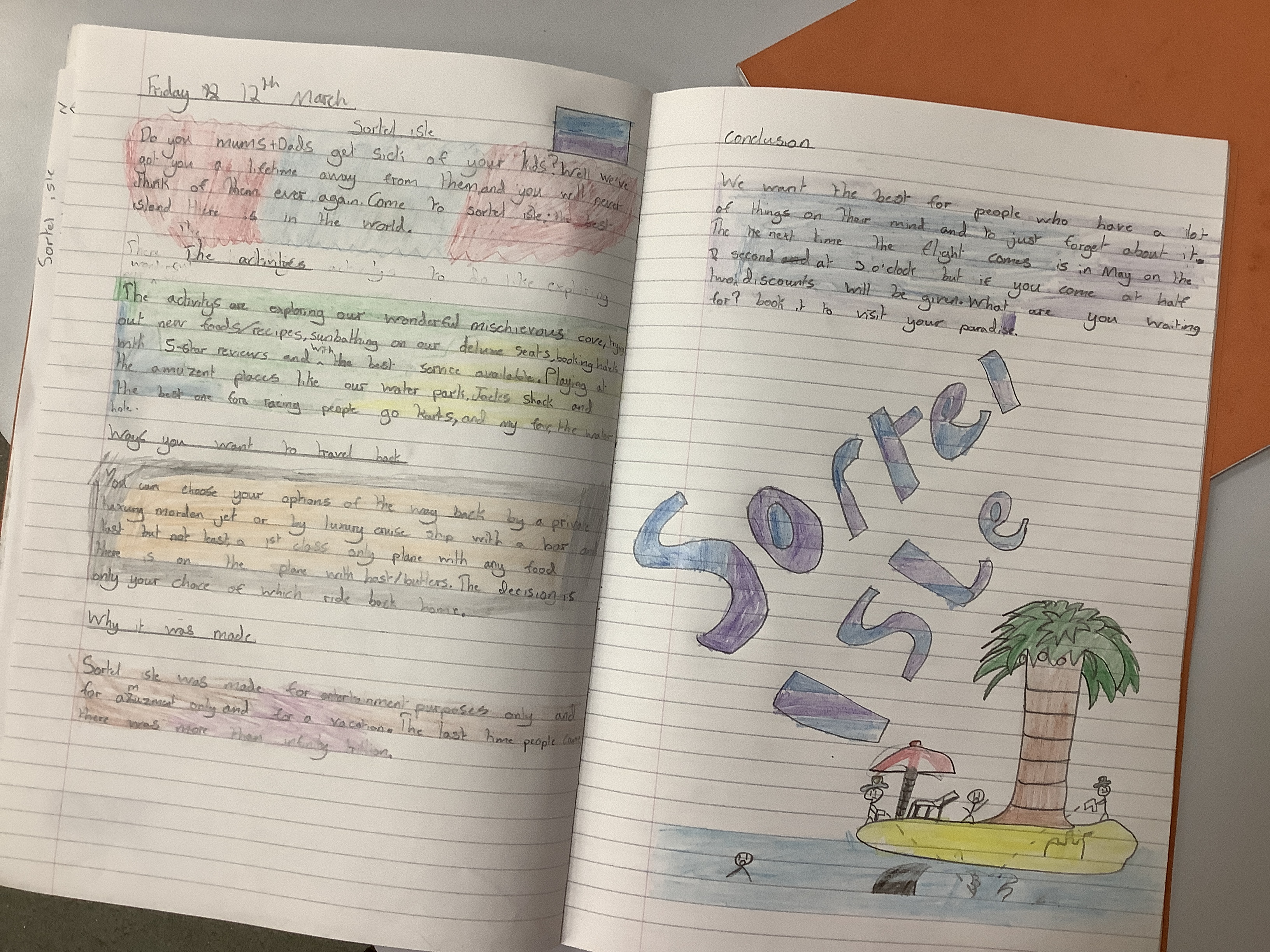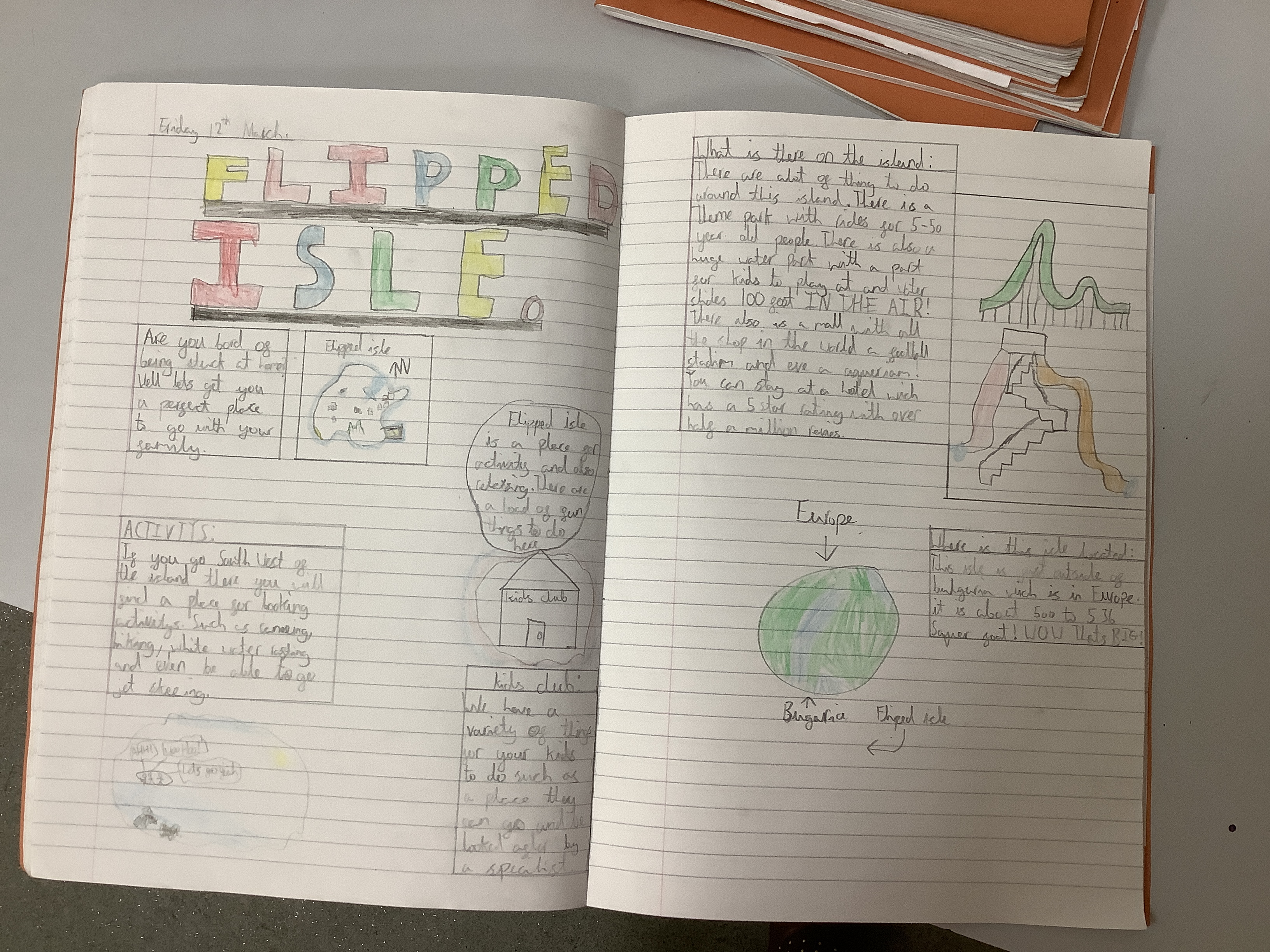 We’ve been doing travel writing for the past few weeks. We went through the whole process of looking at travel writing, watching adverts, reading websites/brochures about vising places, exploring the different kinds of activities people like to do on holiday. We thought about our target audiences and who we would like to market our location to. Each of the children designed their own island and then they had to create a double page spread as if it was in a brochure… and honestly? I am so incredibly proud of them. For our first go, some of them are absolutely incredible.