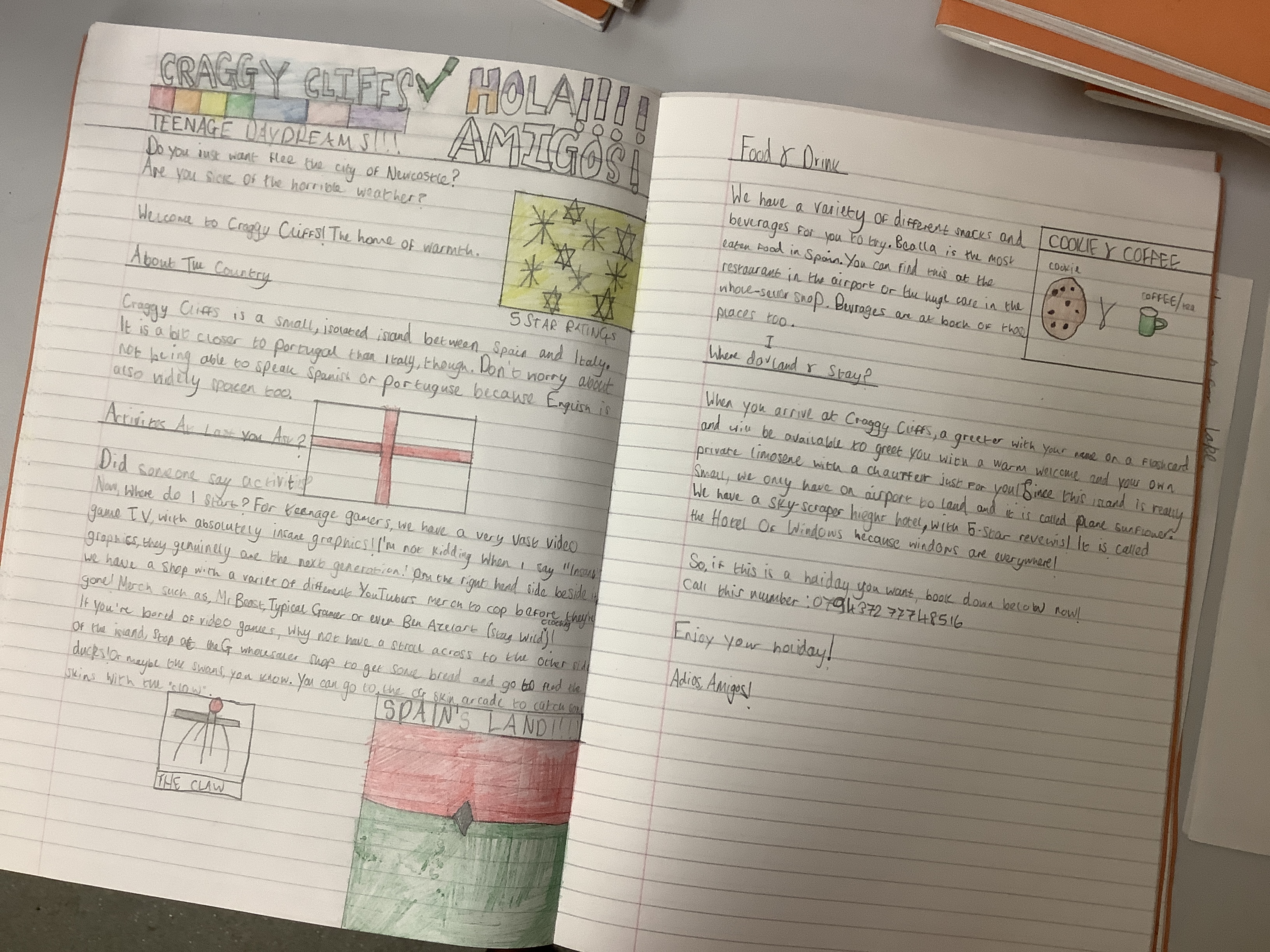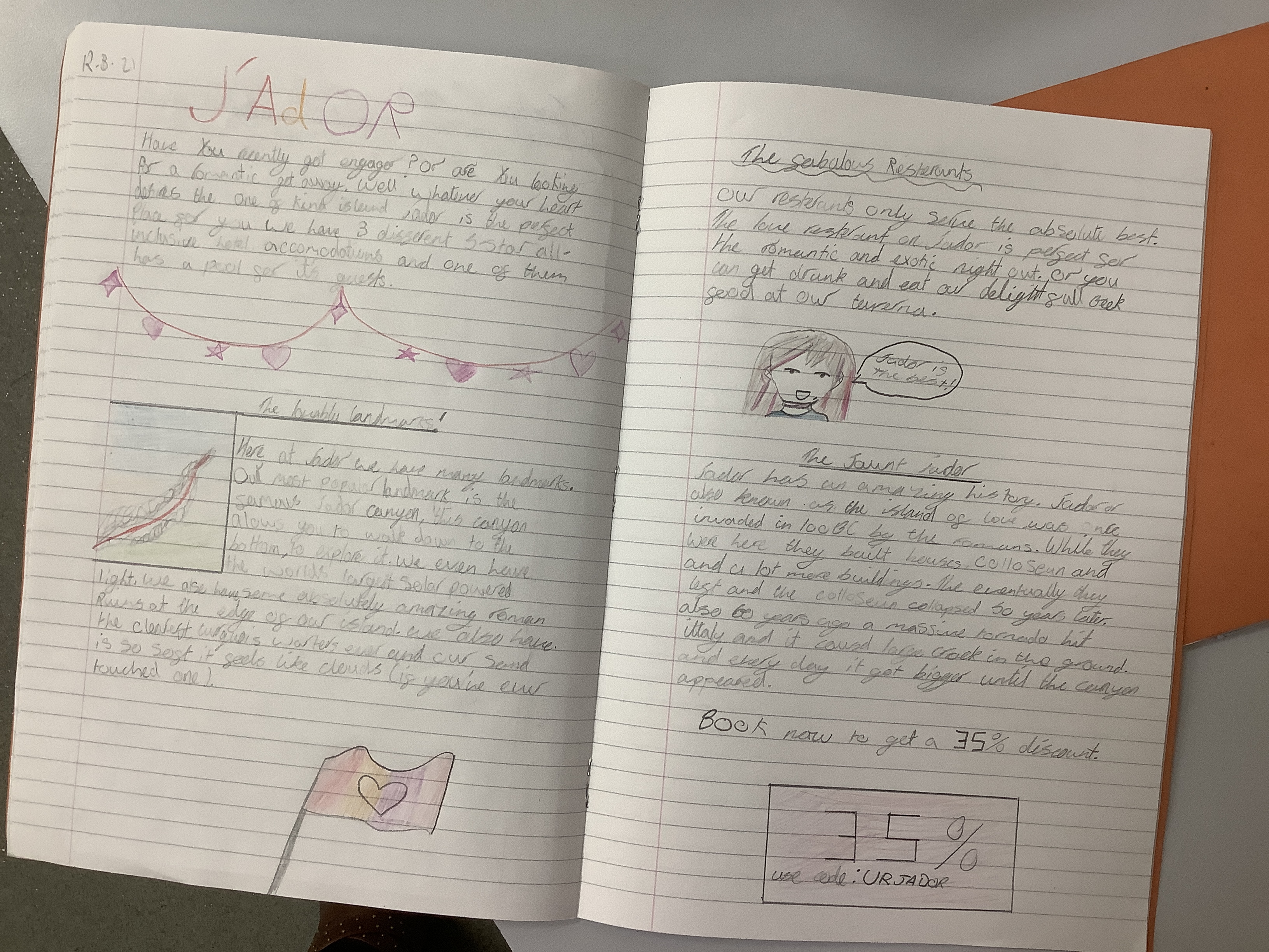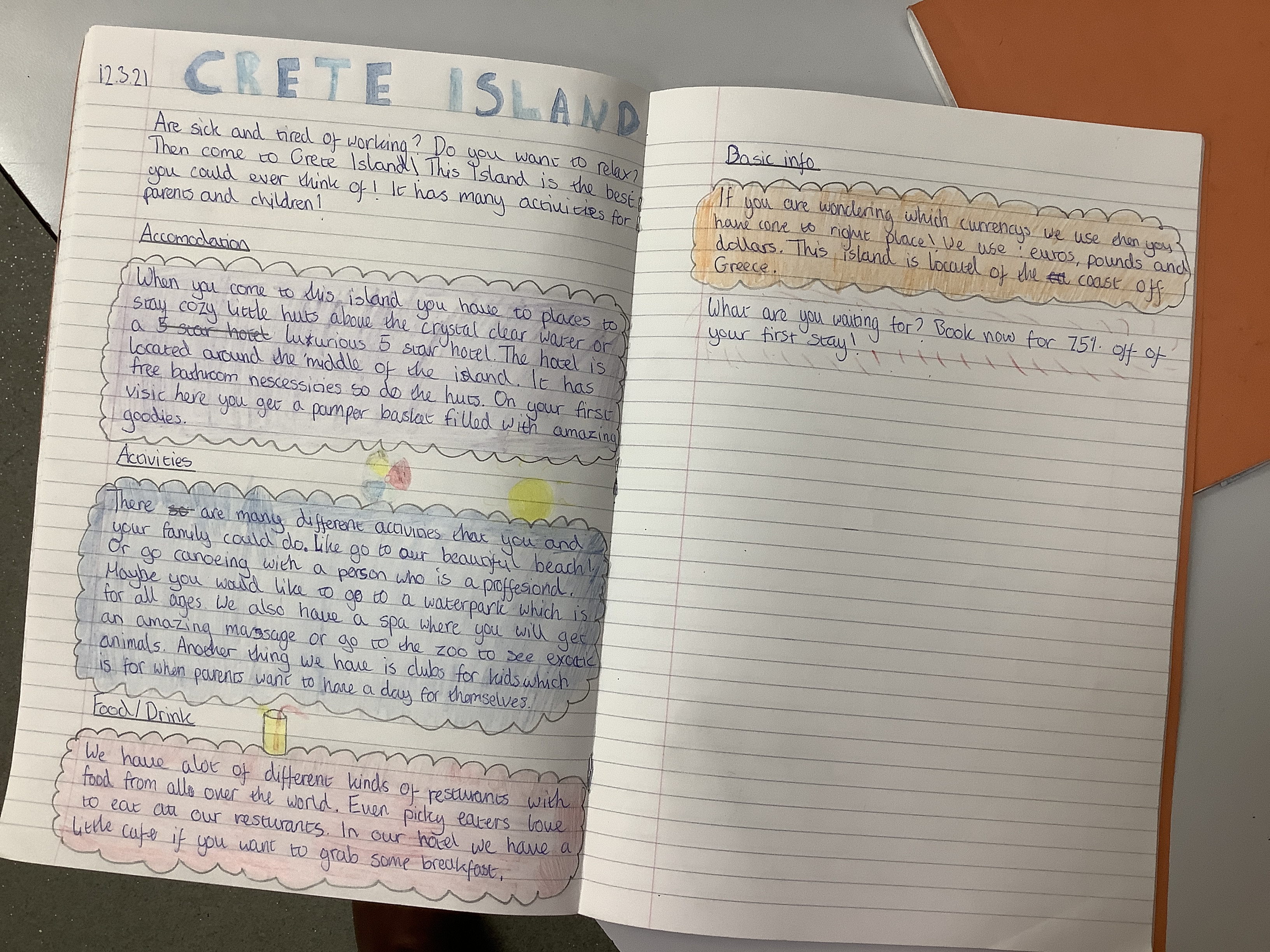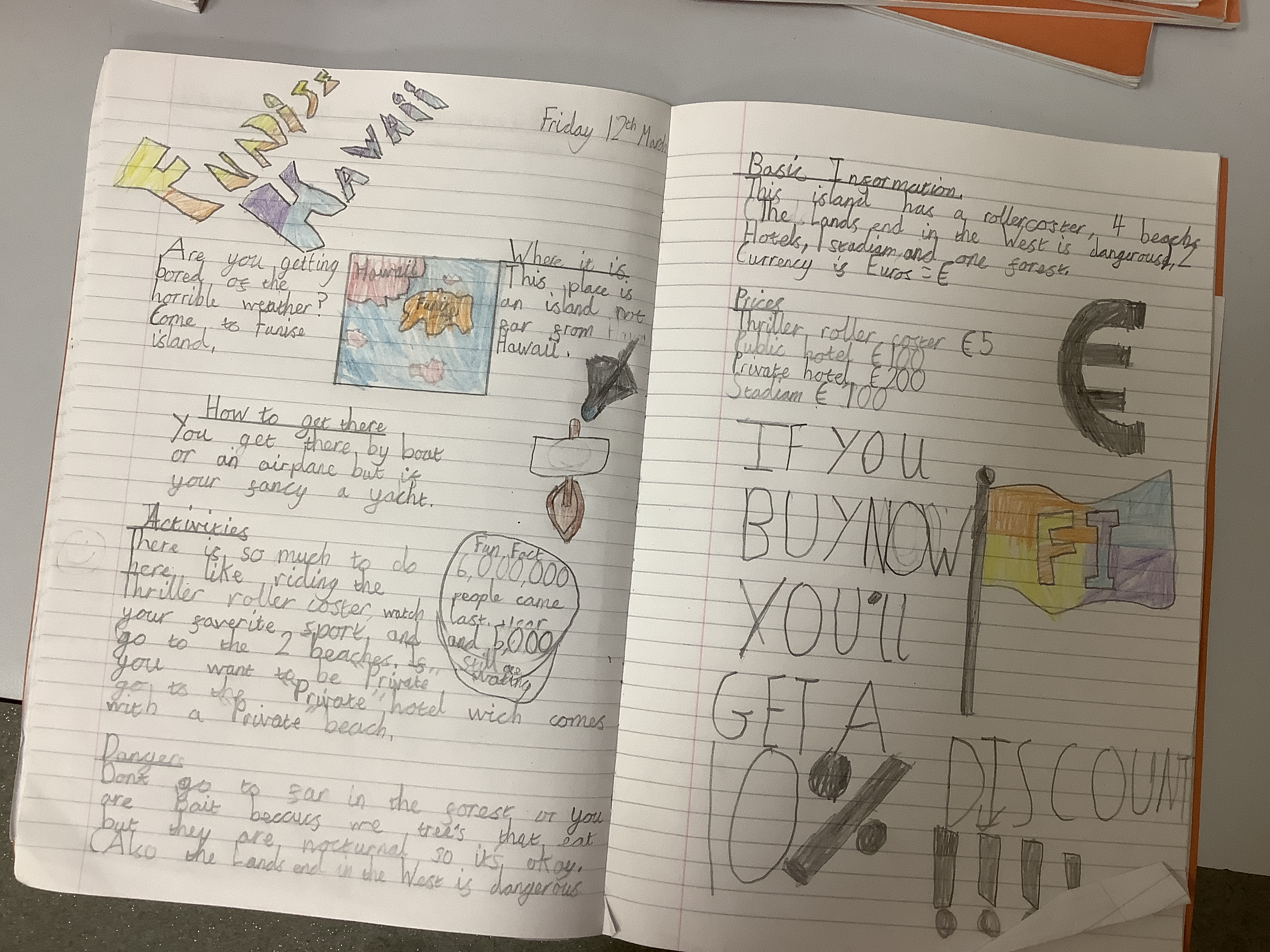 We’ve been doing travel writing for the past few weeks. We went through the whole process of looking at travel writing, watching adverts, reading websites/brochures about vising places, exploring the different kinds of activities people like to do on holiday. We thought about our target audiences and who we would like to market our location to. Each of the children designed their own island and then they had to create a double page spread as if it was in a brochure… and honestly? I am so incredibly proud of them. For our first go, some of them are absolutely incredible.