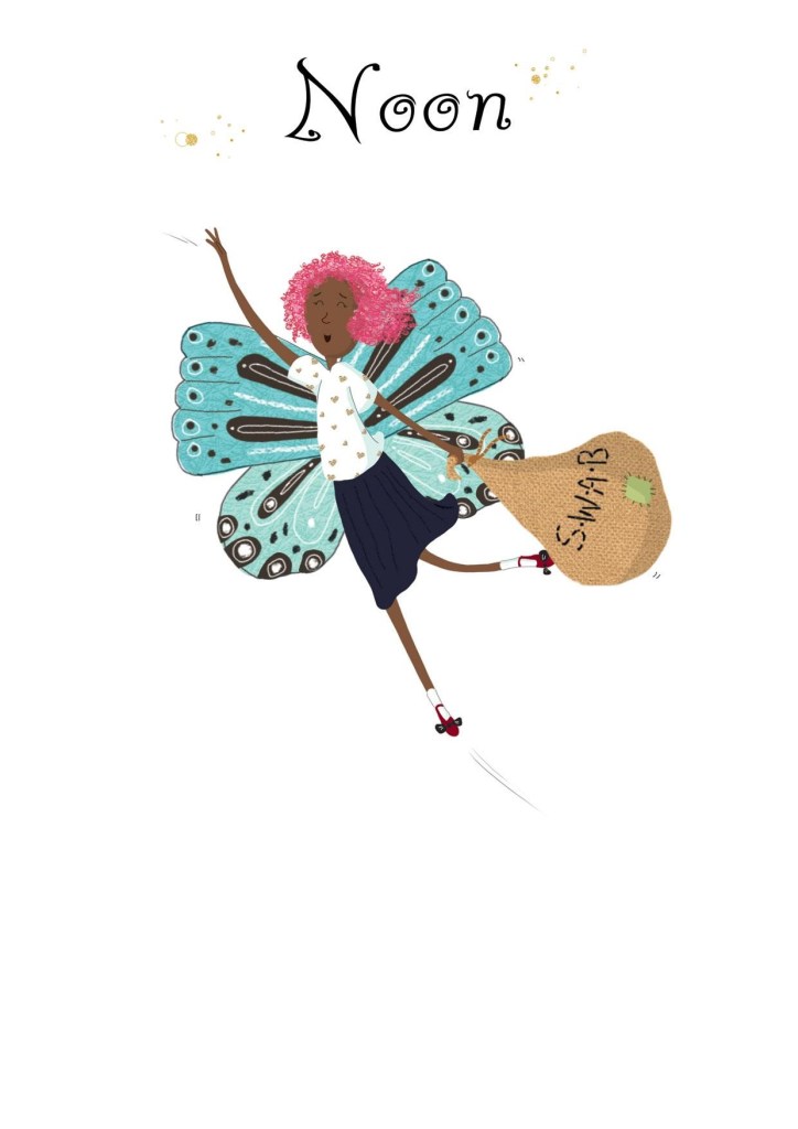 Aziza is seven, and a natural leader and fantastic friend. She enjoys having adventures and has a strong sense of right and wrong from her family’s obsession with superheroes – but Aziza has always preferred fairies, and has read all of the Fairy Power book series. When in her fairy form in Shimmerton, she has orange and black butterfly wings. Her catchphrase is Glittersticks!