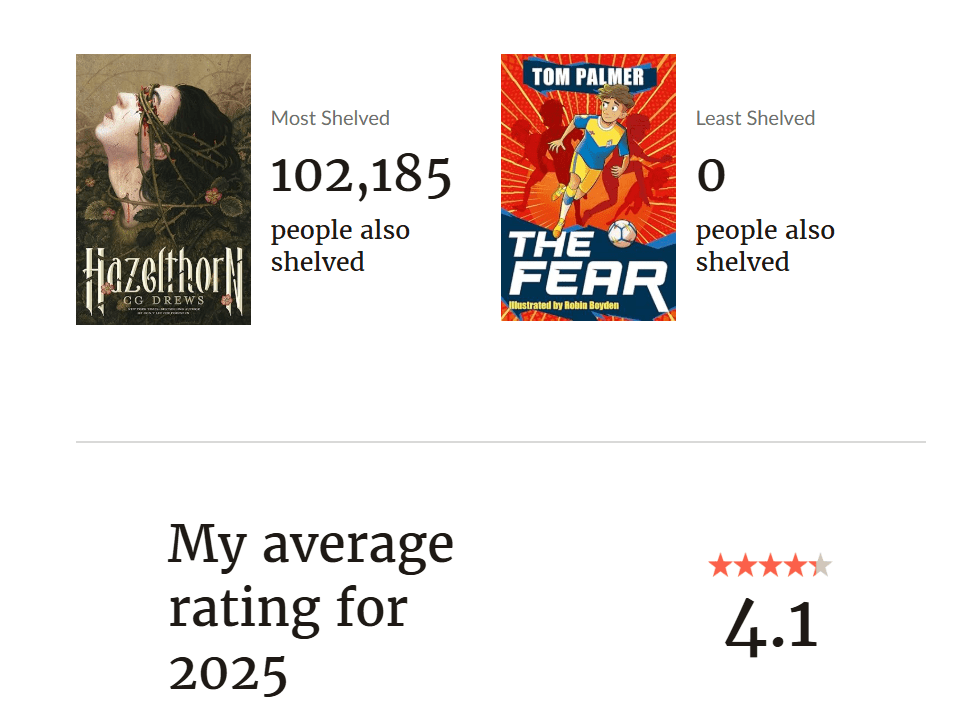 I know lots of people have moved over to Storygraph – I did give it a bash, but it was just a bit much for me… so here’s my stats from Goodreads!