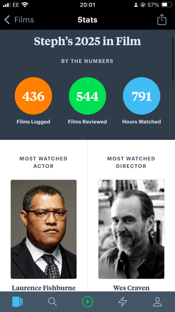 Let’s start off with the basic stats: I LOVE Laurence Fishburne so I’m over the moon that he’s my most watched actor and Wes Craven does not surprise me as most watched director (just as my wife about her Scream obsession, ha). I’m chuffed that I watched 436 films – most of them new to me; some of them rewatches!