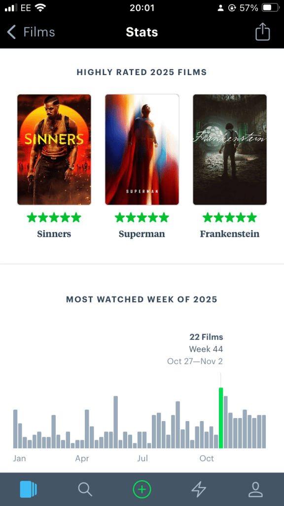 Highly rated films/most watched week: These were 3 of my fave films of 2025 no lies. Definitely recommend them if you have time. My most watched week doesn’t surprise me – it was half term and my wife’s birthday week, so we will have watched a lot of films! I imagine those spikes are all half term/Summer ha.